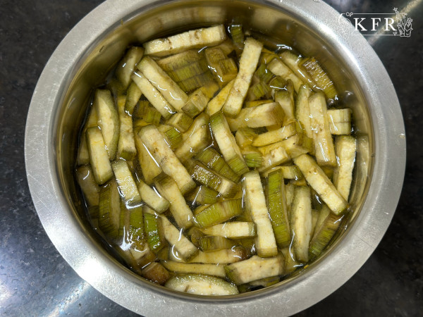 4. Keep the banana pieces immersed in water with salt & turmeric so that they don't brown.